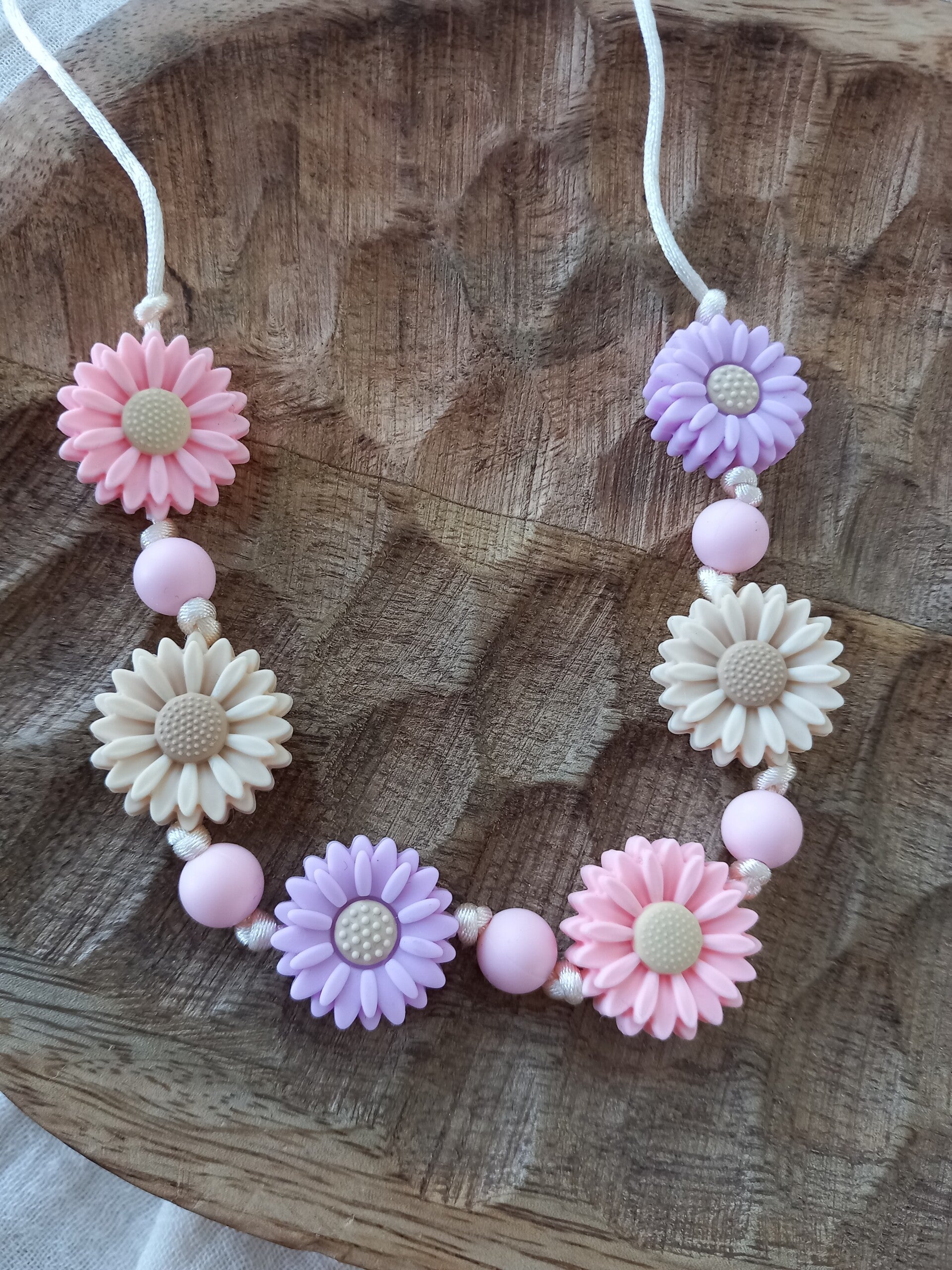Kinder ketting met siliconen kralen en speciale sluiting. De sluiting is extra veilig door de kliksluiting. Als je kindje ergens achter blijft hangen klikt de ketting open.