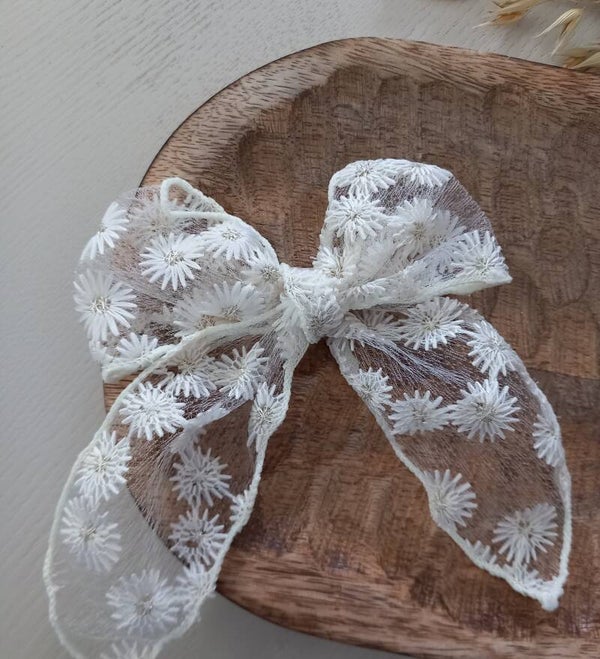 Lieve strik van kant. Bevestigd op een alligator speldje. Verkrijgbaar in 4 kleuren.