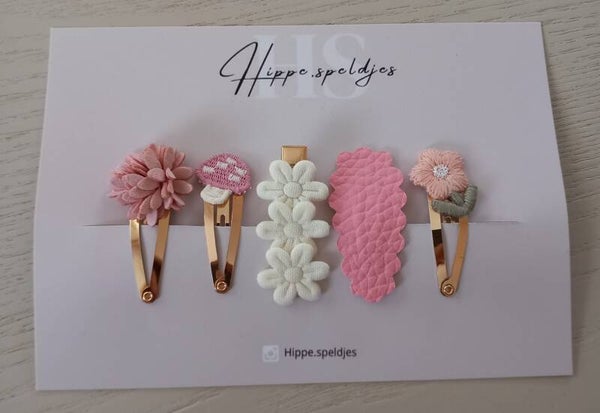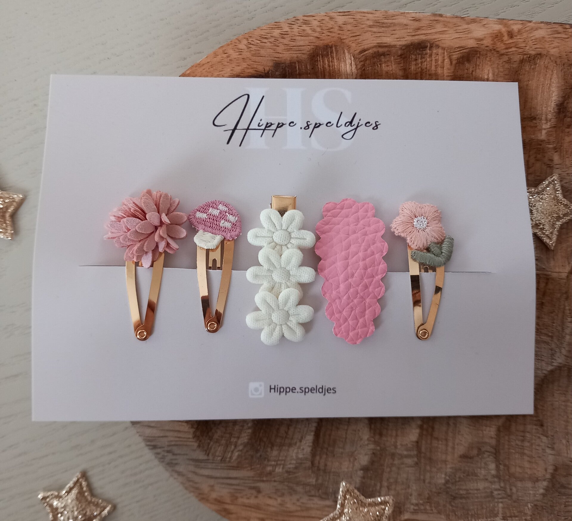 Set pink mushroom. Set van 5 speldjes. Verkrijgbaar op een 3, 4 of 5 cm speldje.