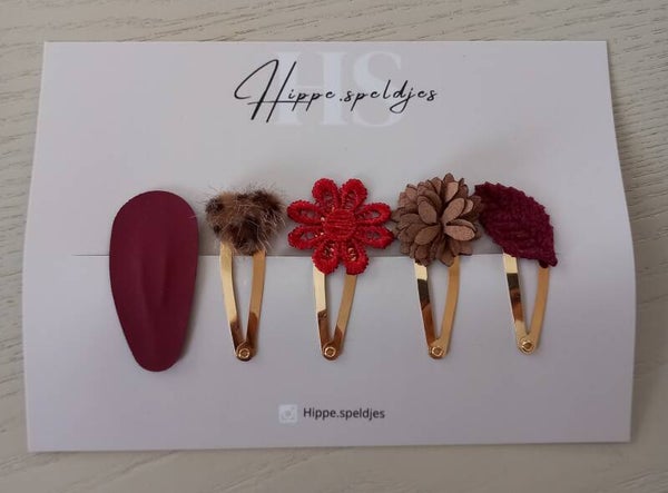 Set burgundy. Set van 5 speldjes. Verkrijgbaar op een 3, 4 of 5 cm speldje.