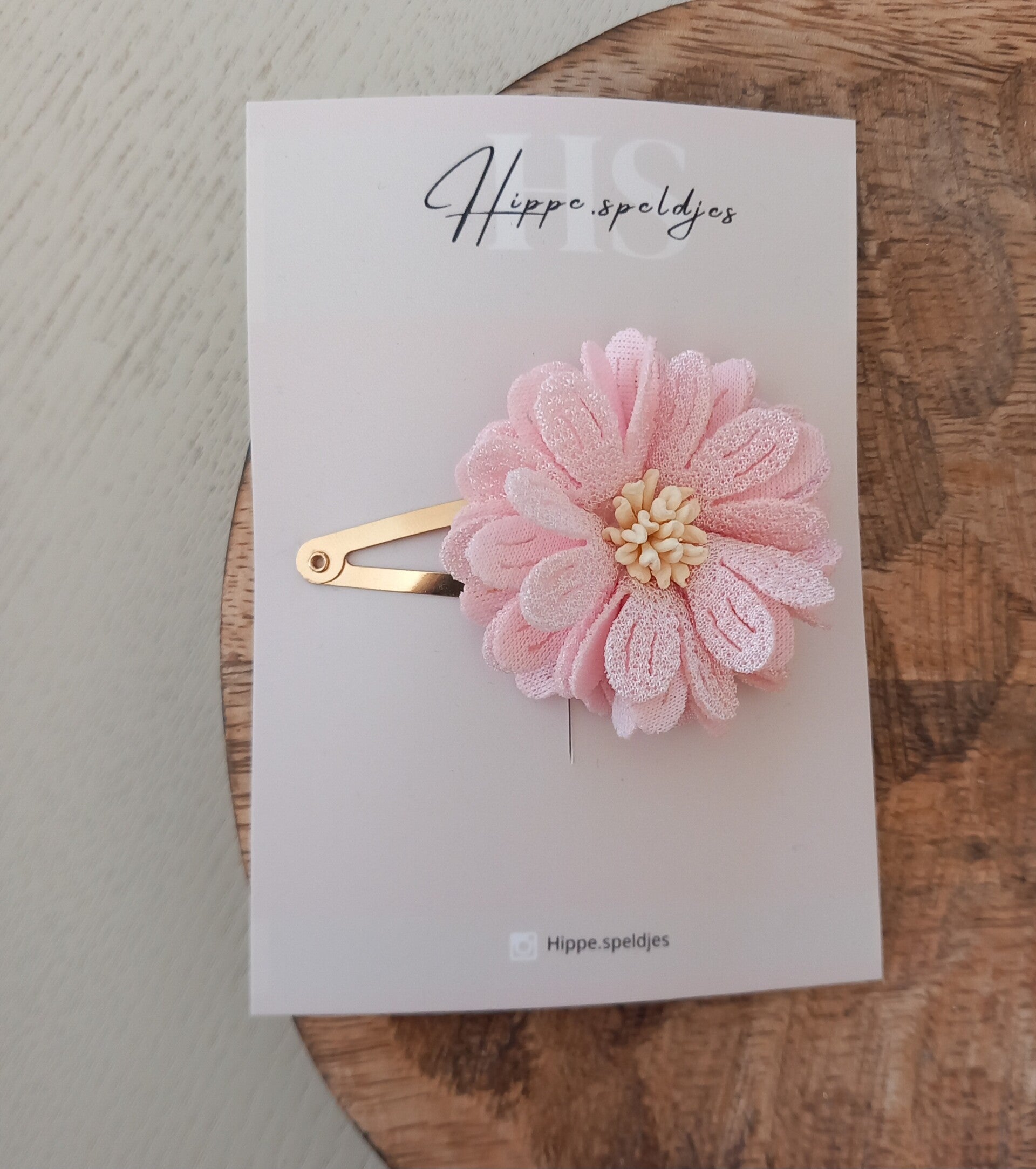 Prachtige zachtroze bloem bevestigd op een klikklak speldje. Keuze uit een 4 of 5 cm speldje.